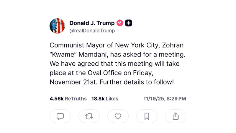 President Donald Trump announced on Truth Social that he will meet New York City Mayor-elect Zohran Mamdani at the White House on Friday, confirming the first face-to-face encounter between the two political adversaries. Trump wrote that Mamdani had requested the sit-down and referred to him as “Communist Mayor of New York City, Zohran ‘Kwame’ Mamdani.” He noted the meeting would take place in the Oval Office and indicated additional information would be released.